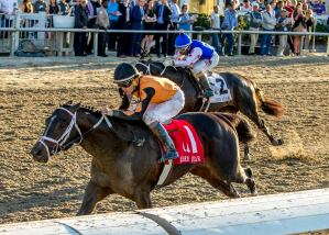 Guest Suite with jockey Robby Albarado aboard captures the $200,000 Lecomte Stakes. Hodges Photography / Amanda Hodges Weir