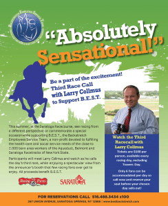 Join NYRA race caller Larry Collmus in his booth for the third race to support Backstretch Employees Service Team. Up to nine people can participate each day for $100 per person, with all proceeds going to support BEST’s work with backstretch workers. To reserve a spot, call (516) 488-3434 ext. 100 or (518) 587-3720.