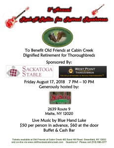 Rock N Roll for Retired Racehorses to benefit Old Friends at Cabin Creek. Head to Nanola on Route 9 in Malta, just south of Saratoga, for a buffet and cash bar to support Old Friends’ retirees. Live music is courtesy of Blue Hand Luke; tickets are $50 in advance, $60 at the door. Call 518 698 2377 to purchase tickets or for more information; you can also buy tickets at the farm or online.