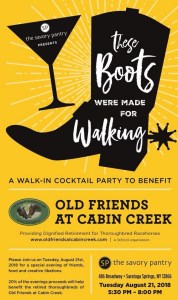 Walk-In Cocktail Party to benefit Old Friends at Cabin Creek. Stop by The Savory Pantry on Broadway and sample their varied specialty items and libations. A chef and bartender will be on hand to serve finger food and signature drinks. 5:30 – 8 pm, no tickets required. A portion of the evening’s sales will be donated to help support the retired Thoroughbreds of Old Friends at Cabin Creek.