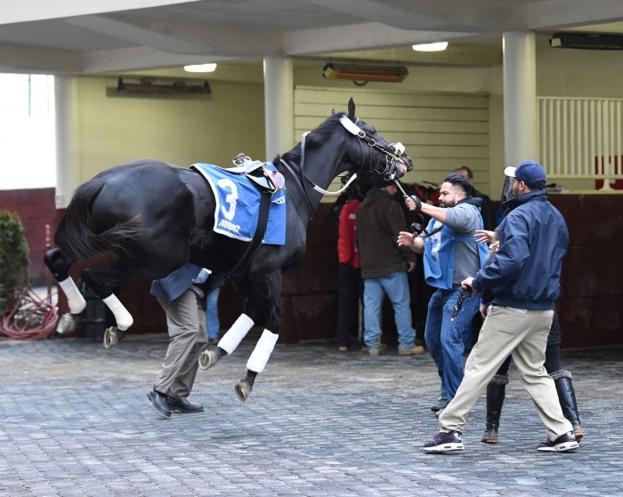 Independence Hall kickin’ it in the paddock before the Jerome Stakes at Aqueduct. Photo: NYRA/Susie Raisher