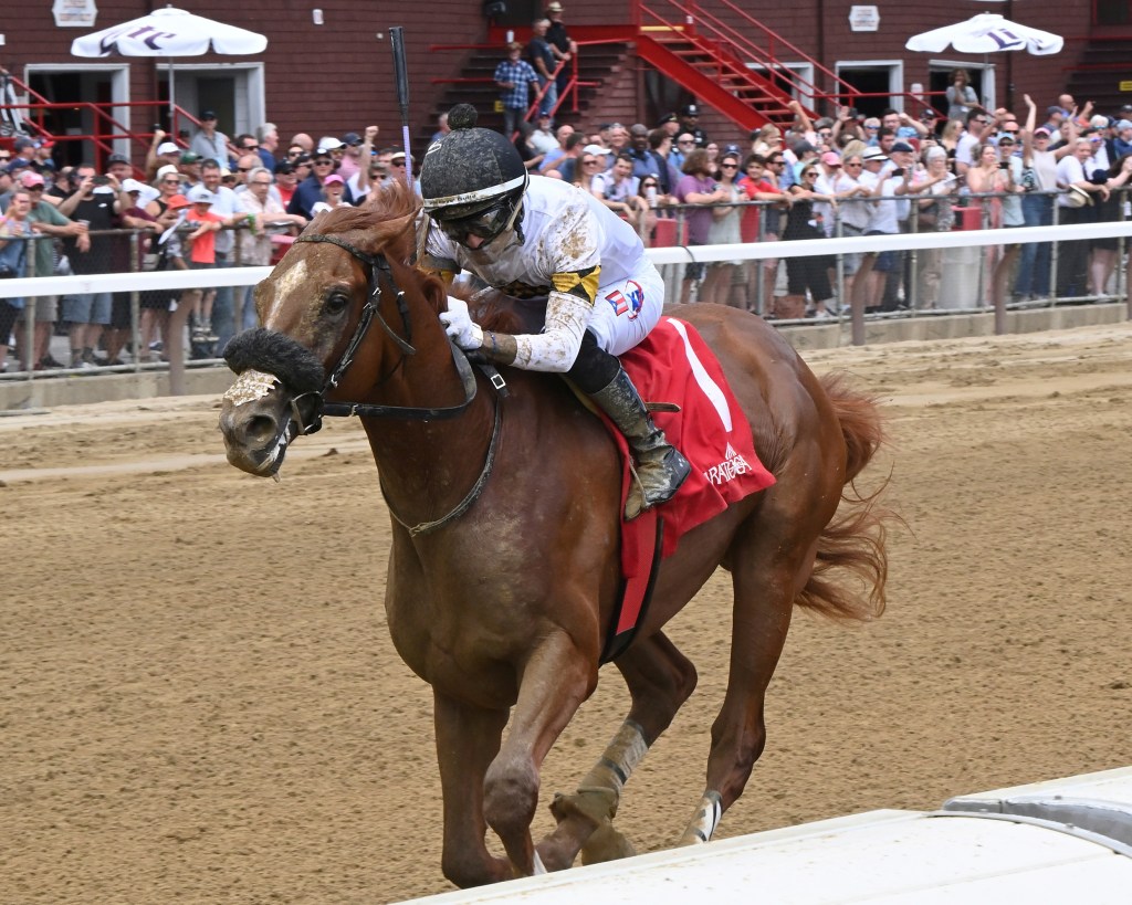 In the first stakes race of the four-day Belmont Stakes Racing Festival at Saratoga Race Course, the two-year-old colt broke with alacrity from post 1 under jockey Xavier Perez, putting a head in front in the opening jumps before being taken about 10 lengths back. Odds-on favorite Touchy tangled withsecond choice Three Echoes and longshot Shoot the Nickel up front before establishing a clear lead heading into the far turn of the 5 1/2-furlong race.
