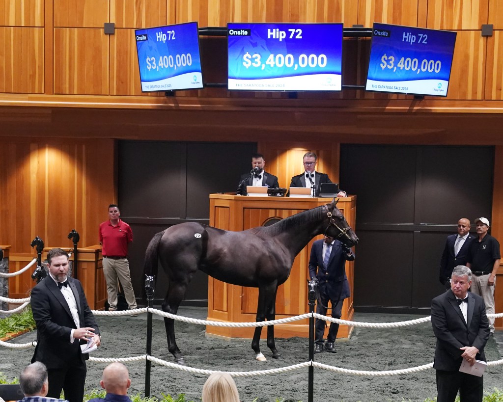For Zedan Racing, agent Donato Lanni signed a ticket for $3.4 million for Hip 72 after a protracted bidding battle on the first night of the Fasig-Tipton Saratoga Sale for a Not This Time colt out of the Tiznow mare Kayce Ace, the highest price for the session.